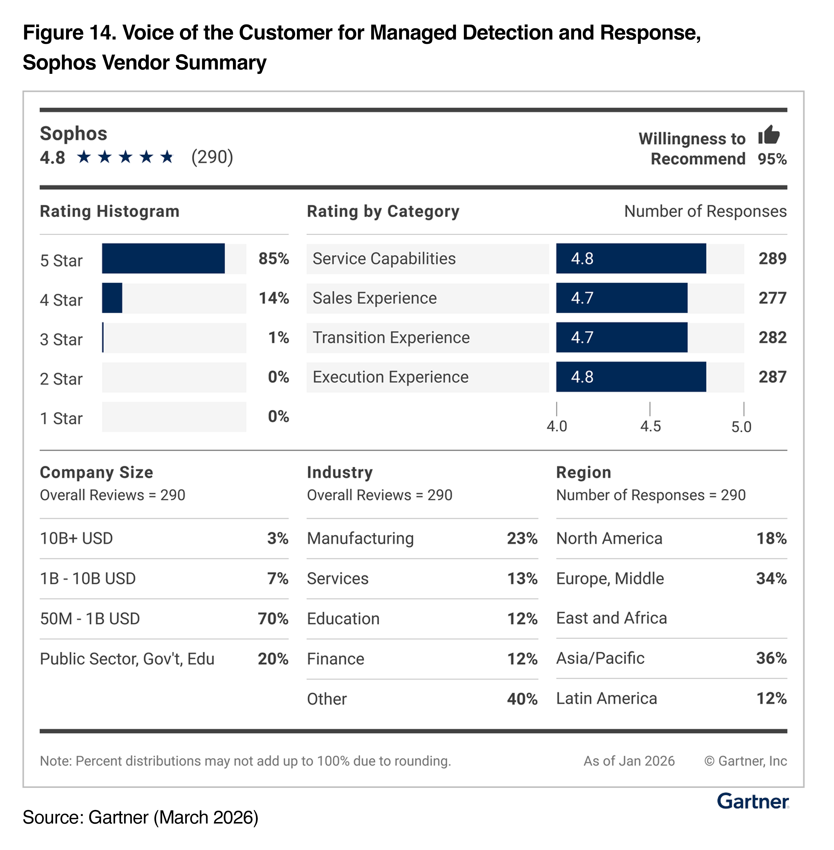 In the 2026 VoC report for MDR, Sophos has an overall rating of 4.8 / 5.0 based on 290 reviews, making Sophos the most-reviewed vendor in the report. To go with this, customers rated Sophos with a 95% Willingness to Recommend score.